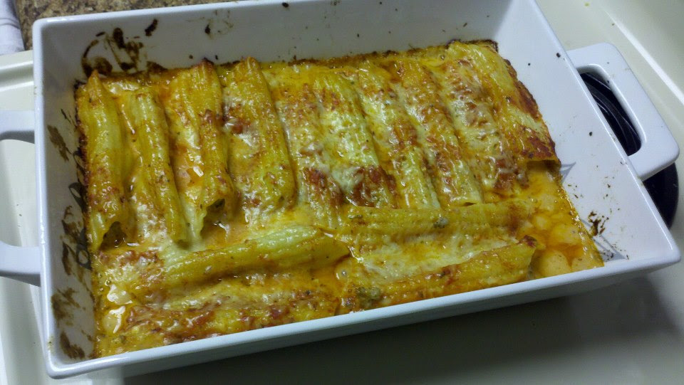 For dinner, Kimmy and I tried something new: Manicotti! We tried to combine two different recipes because I liked the stuffing from one but the ability to not pre-cook the noodles from the second. They turned out decently, but a little over-cooked.